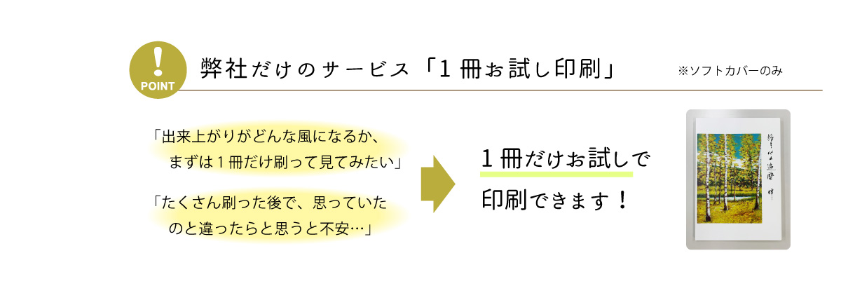 数冊から承っておりますのでご安心ください。 昔は印刷というと多く刷るものでしたが、今は少部数でもご対応可能です。 また、数を刷る前に試しに1冊だけ刷ってみるサービスも承っております。(ソフトカバー、定型サイズのみ) ぜひご相談ください。 |