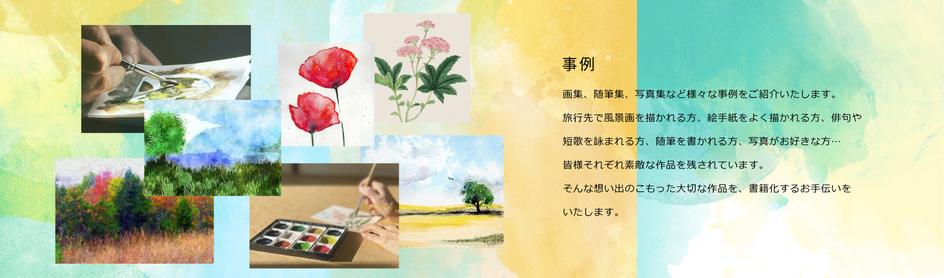 | ・ご両親の喜寿や米寿、金婚式などのお祝いに記念誌を作りたい ・亡くなった方の残された文章や絵画、写真や研究などを本にして後世に残したい etc... 是非ご相談ください。 |